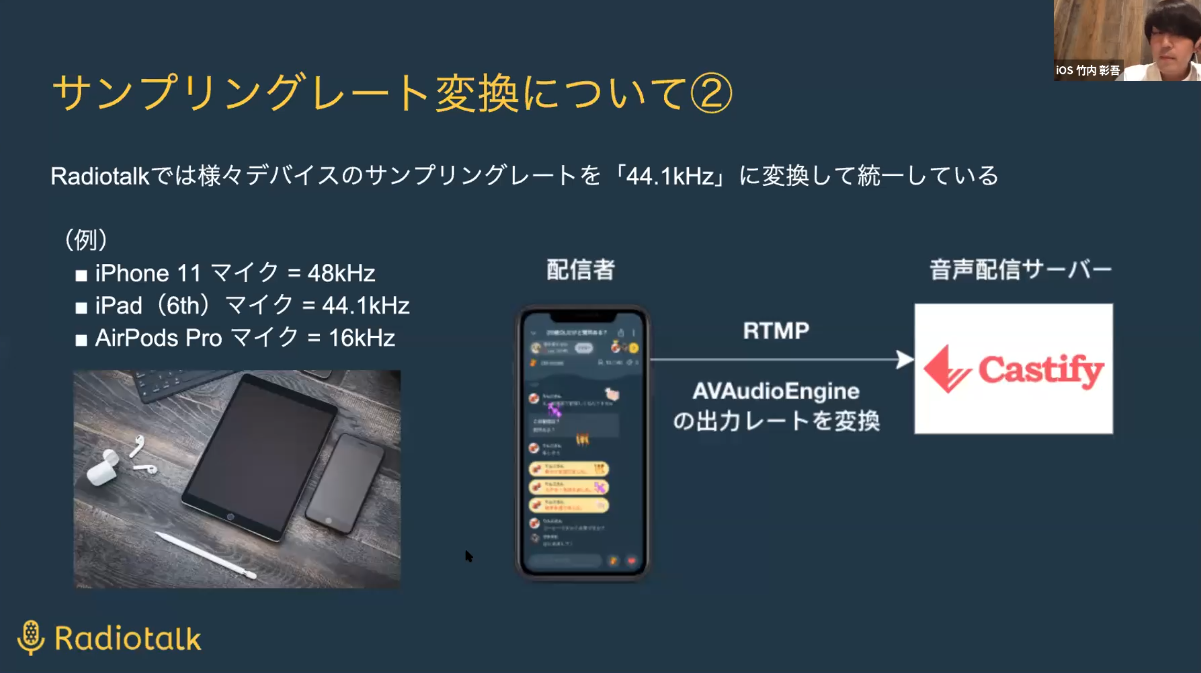 iPhoneから音声データを取得し、音声サーバーに流すまでのあいだに、低レベル(ハードウェア制御に近い)APIを用いた実装が必要になります。実はこの部分こそが、結構頭を悩ませるポイントでした。iPhoneやiPad、AirPodsなどのApple製品は、それぞれ製品ごとに機器の音声サンプリングレートが異なっています。Radiotalkでは、これらのサンプリングレートをひとつに統一するため、アプリ側で変換を行っています。