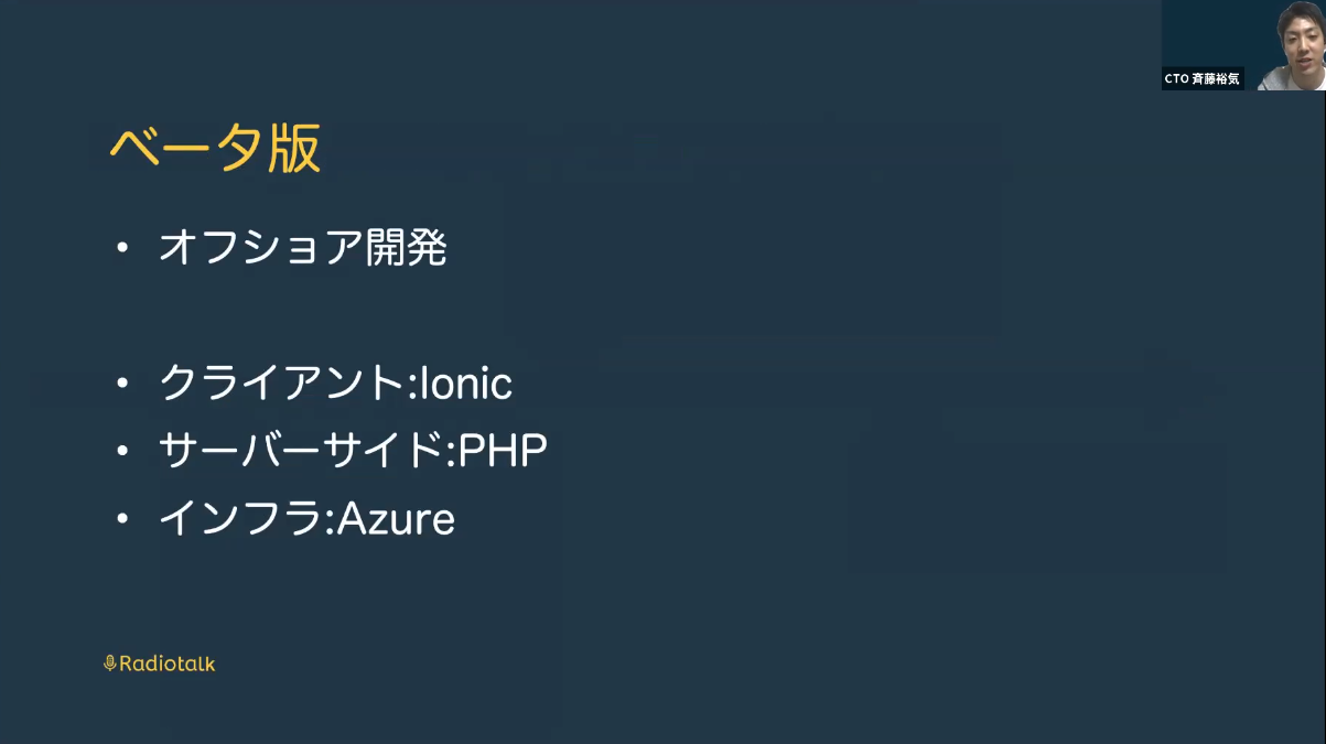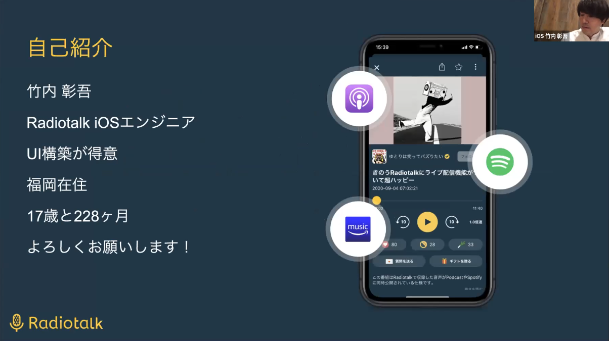 最後のLTは、Radiotalk iOSエンジニア 竹内彰吾による「Radiotalk iOSの音声配信技術について」。Radiotalkの根幹をなす音声配信技術についてお話しました。