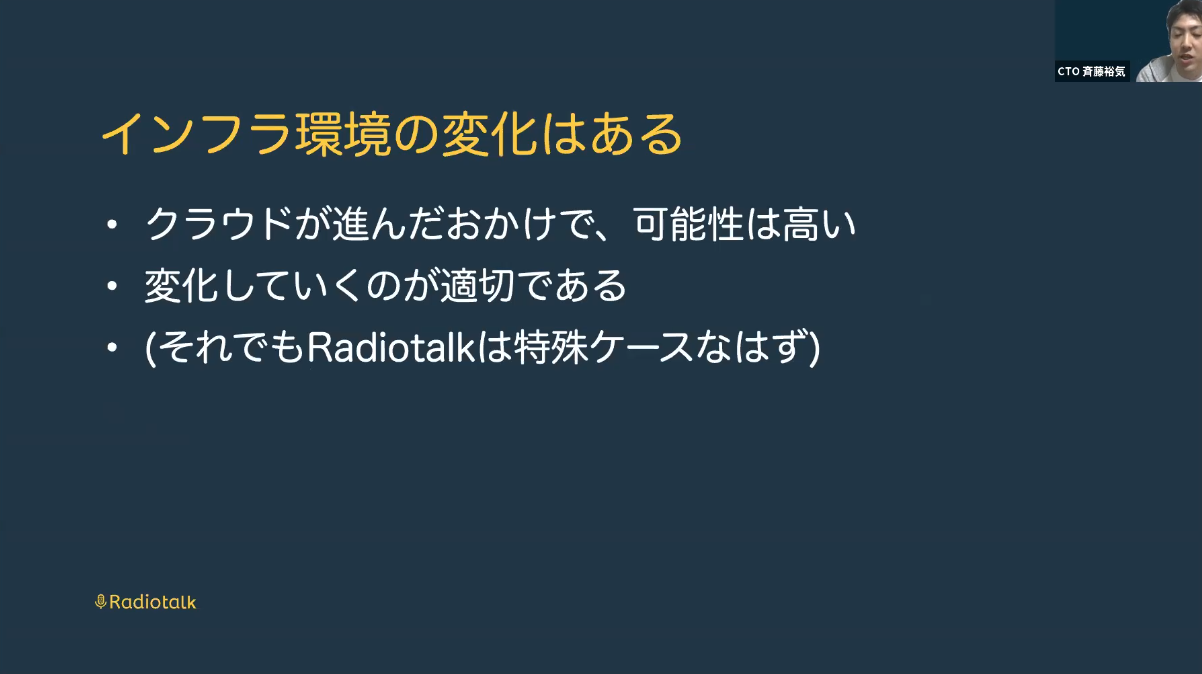 Radiotalkのようなサービスにおいては、機能の変化に応じてユースケースや、使用するインフラの構造もめまぐるしく変化していきます。今回はこのインフラ部分に焦点を当ててお話をしたいと思います。