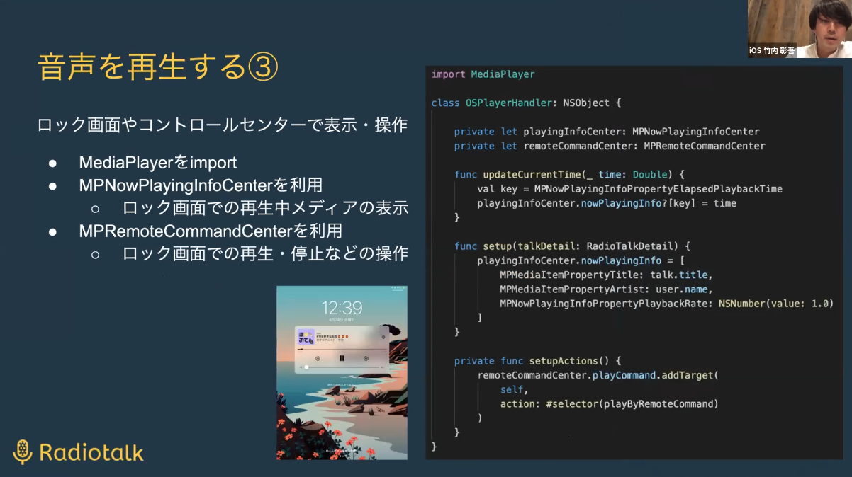 iPhoneのコントロールセンターやロック画面で、現在再生しているメディアの情報が表示されるのをよく目にしますが、こうした挙動もその都度実装しなければいけません。Radiotalkでは「MediaPlayer」クラスをimportし、その中の「MPNowPlayingInfoCenter」「MPRemoteCommandCenter」モジュールを組み合わせて実現しています。