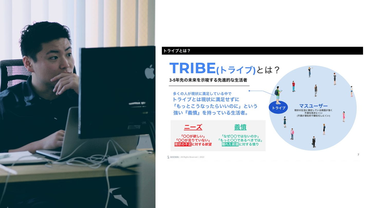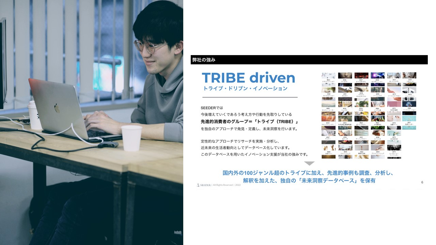 SEEDERは、TRIBE(トライブ)をヒントに、近未来の生活者の価値観や行動の変化を洞察し、得られた知見を元に様々なクライアントとのプロジェクトや自社主体のプロジェクトを通じて、社会に商品、サービスを届け、社会に変革をもたらす企業です。