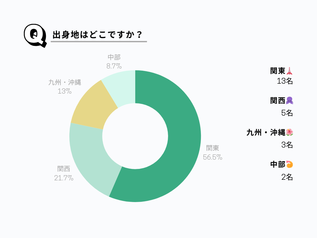 まずは出身について、圧倒的1位だったのが「関東地方」。半分以上の方が関東圏出身のようでした。