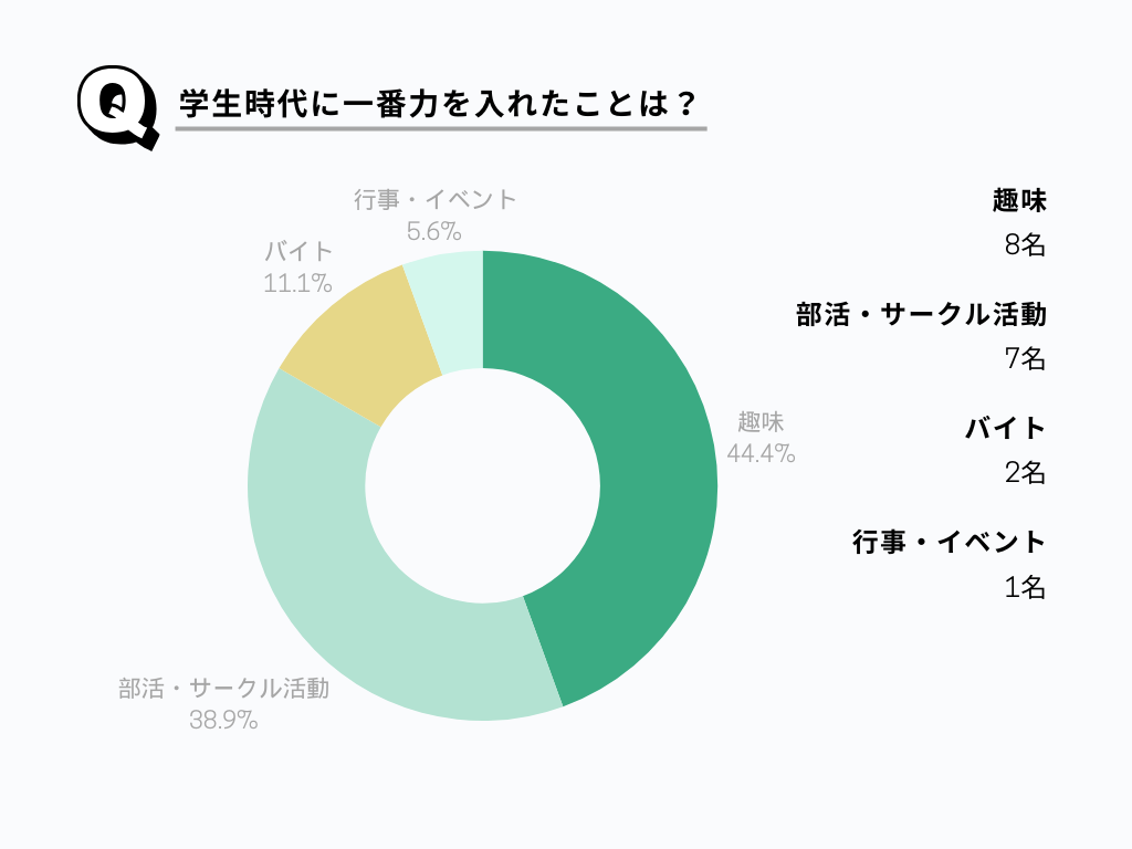 学生時代に力を入れたことは、【趣味】と答えた方が最多でした!