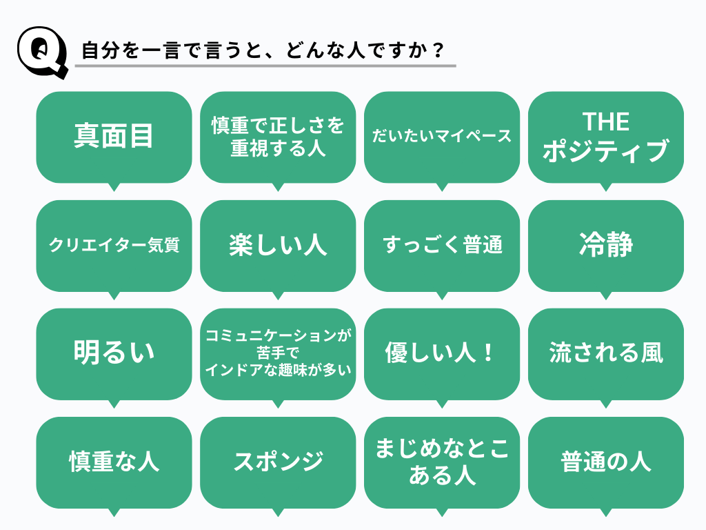 自分を一言で表すと?という質問に対しては、十人十色の答えが返ってきました!