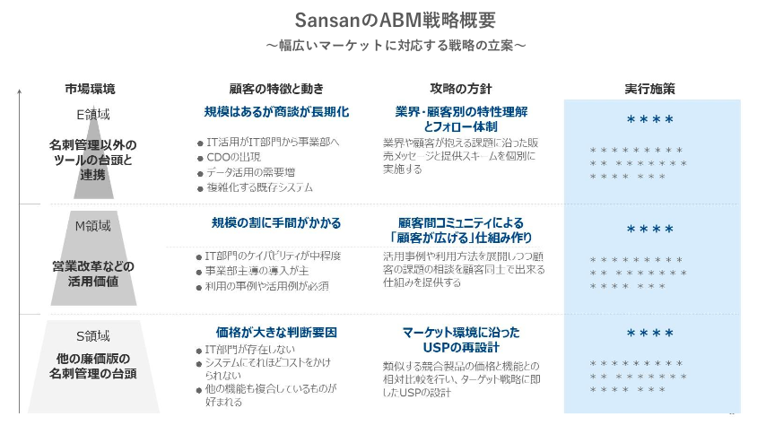 Sansanでは、企業を従業員規模別にS(1〜200名)・M(200~1000名)・E(1000名以上)のセグメントに分けてターゲティングし、それぞれの領域毎の特徴・動きを踏まえたABM戦略を立てています。
