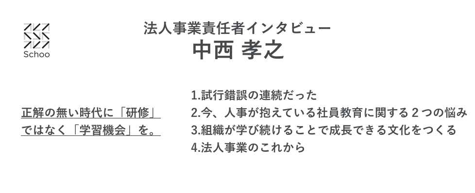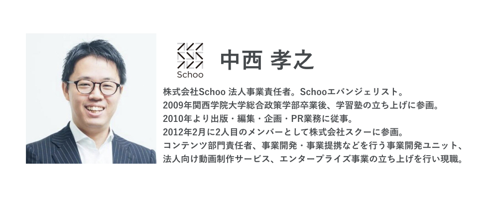 Schooの創業期からのメンバーで、4月より法人事業を管掌している中西に事業の「これから」を聞きました。