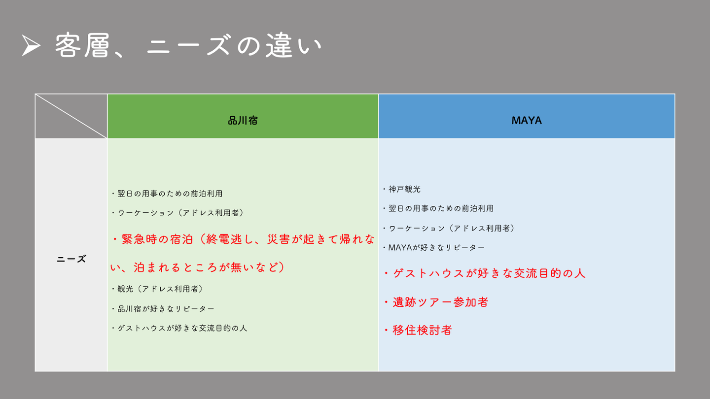 ニーズに関しては、品川宿と萬家で異なる傾向が見られます。品川宿の場合はビジネス街に位置しているため、特に多いのが「翌日の用事(イベントや品川周辺での仕事)のための前泊利用」や、「終電逃し」、「(地震や停電など)の災害が起きて帰れない際の緊急宿泊先」としての機能も果たしています。