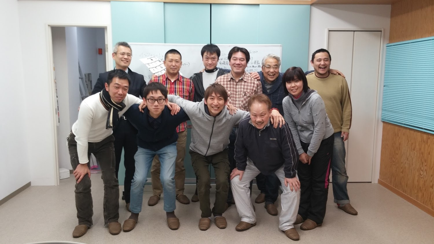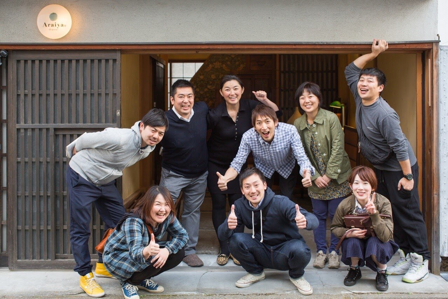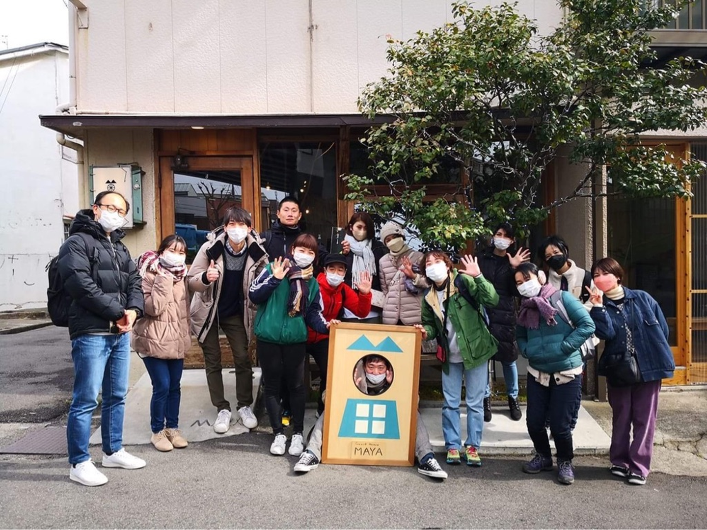 ▲宿場ファミリー(上段左から2番目:宿場JAPAN代表の渡邊(タカさん)、下段左から1番目:ゲストハウス蔵の山上万里奈さん、上段右から3番目ゲストハウス萬家の朴徹雄)