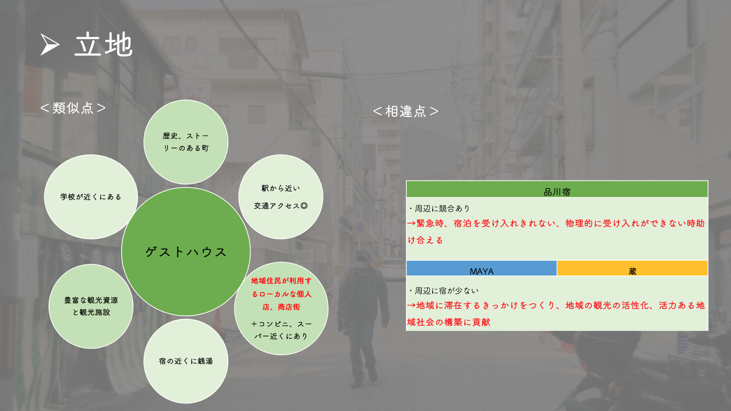 地域融合型ゲストハウスを掲げる宿場JAPANとしてのポイントは、①観光地ではなく、地域住民が生活の一部として利用している「ローカルな商店街」であること。さらに②オーナーの顔が見えやすい「個人店」が多いことです。