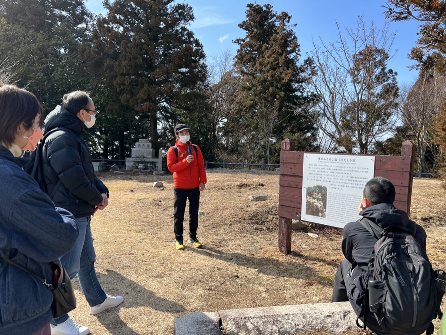 ▲摩耶山頂上にある旧天上寺跡前でMAYAのスタッフガイドによる解説。(エミュー撮影)