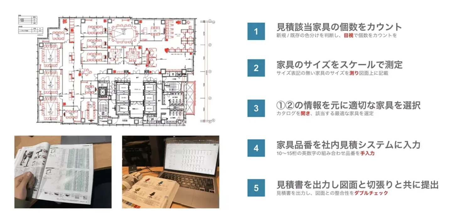 作業内容としては、A3用紙の図面を印刷し、その中にある椅子や机の個数を目視で数え、サイズ表記がない家具は定規でサイズを測り、広辞苑くらい分厚いカタログから該当の家具を探し出し、10〜15桁程の品番を手入力するという、非常にヒューマンエラーが起きやすい作業構造になっています。
