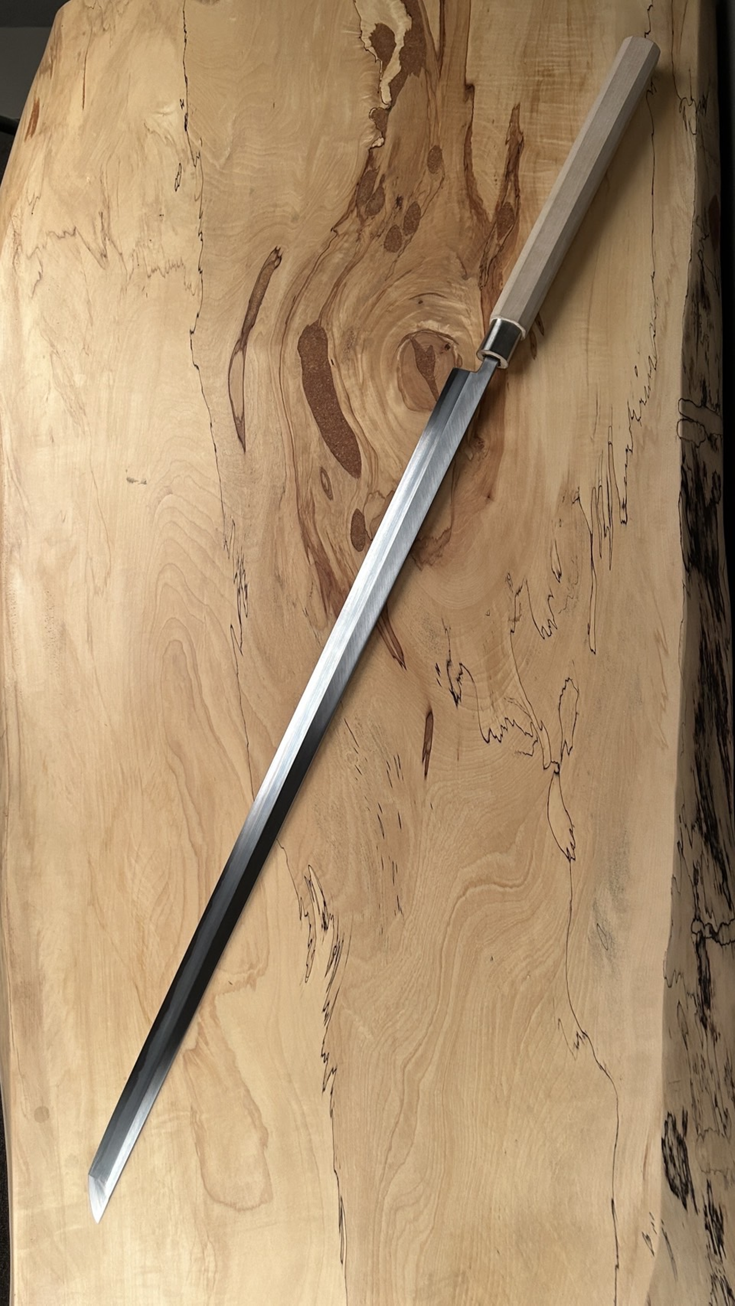 ※刃渡り750㎜のマグロ切り包丁。上記は柄を付けた完成品。