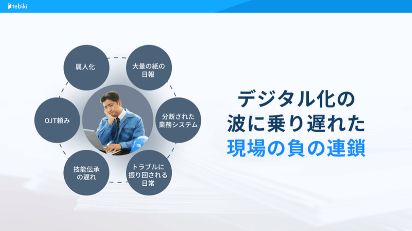 このとき、何よりも苦労したのが現場教育です。なかでも生産性の鍵を握る機械オペレーター教育が特に難しく、新人が育成できずに優秀なベテラン社員に著しく高い負荷をかけてしまいました。今でもtebikiユーザーのペルソナは当時の自分自身です。あの時、あの状況をなんとかできなかったのか、その問いが今も私を動かしています。