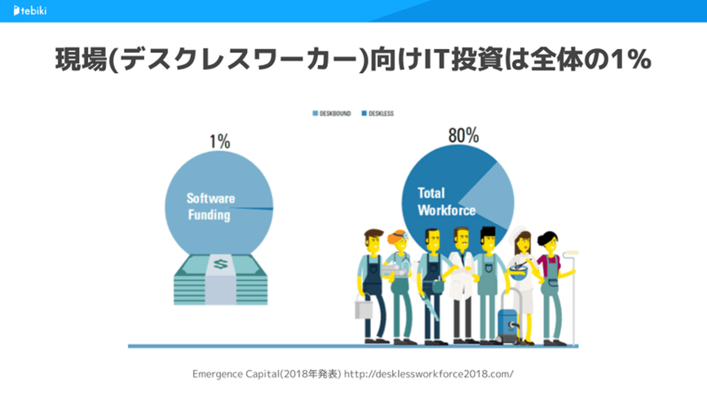 tebikiのターゲットユーザーは、小売/サービス/製造/物流/介護/飲食など、デスクを持たない人達が働く「デスクレスワーカー」です。デスクレスワーカーは世界の労働者の8割を占めるにもかかわらず、IT投資全体に占める割合がわずか1%と言われていた産業です(※)。この産業のマクロ環境の構造変化が、tebikiの成長の背景にありました。