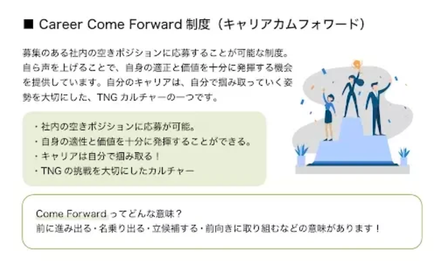 今回の募集は、TheNewGateの【Career Come Forward制度(キャリア カム フォワード)】を活用した社内公募です。