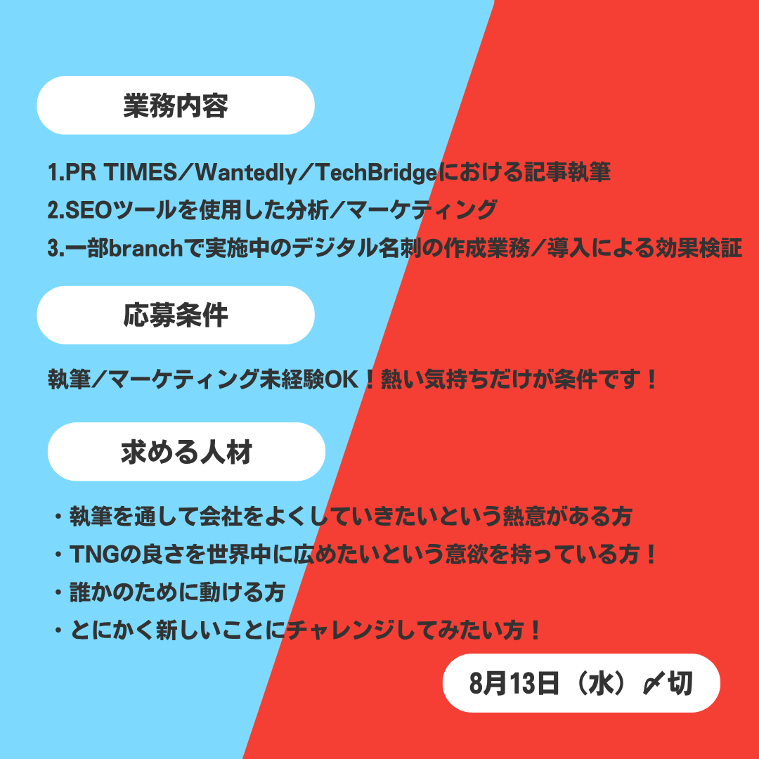 この度、TheNewGate内でWantedlyや、オウンドメディア TechBridgeの運用を担当しているTDPチームに、新しい仲間が加わりました!