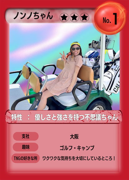 不思議オーラが魅力のノンノちゃん。発想力もピカイチです。そしてまさかの過去に作り話で作文の受賞歴も・・・!?!?詳細はご本人まで(笑)Theポジティブ元気ウーマンなので、今後のTDPは今まで以上に賑やかになりそうです!!