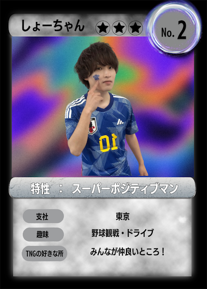 物腰が柔らかく、みんなを包み込んでくれるしょーちゃん。野球観戦が好きなのに、なぜかプロフィール写真はサッカーユニフォーム。普段はミステリアスなオーラを放っていますが、話せば話すほど実は熱血タイプ。そしてなんとTDPメンバーの中でもTheNewGate歴が圧倒的に長く、TheNewGate愛が人一倍強いです!!
