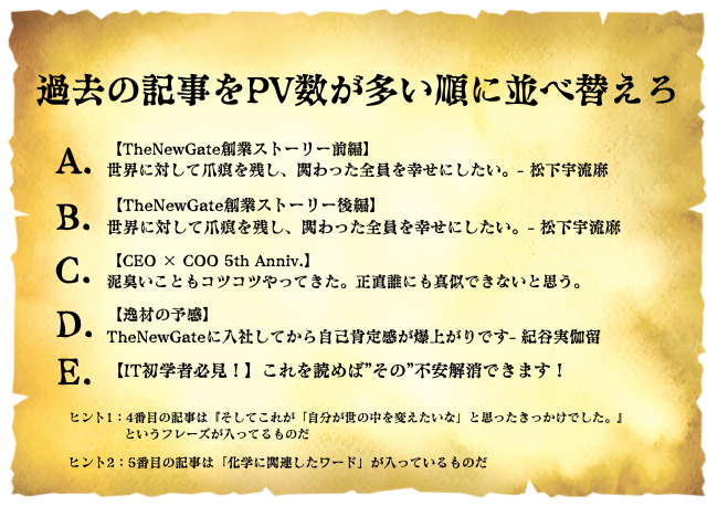 「Wantedlyで過去に投稿した5つの記事の内、PV数が多い順に並べろ。正解を導き出せば、その答えが次のオンラインルームへ入室できる鍵になっている」という問題。