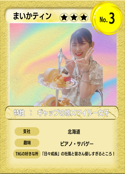 TDPメンバーの中でも圧倒的癒しのまいかティン。しかし趣味はなんとサバゲー。見た目の可愛さとギャップ萌えですね・・・!彼女はなんとTDP加入のために、挑戦条件として定められていた学習Step4まで超特急で終わらせた猛者なんです!何事にも「全力投球」のラブリーまいかティンの今後の活躍に注目ですね!