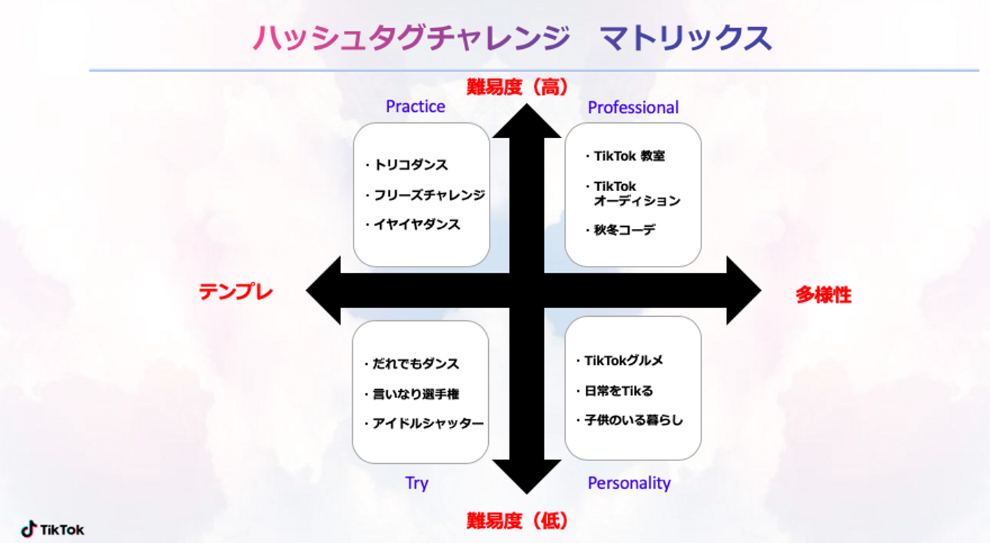 このように、多種多様でユニークなチャレンジが、TikTokを盛り上げてくれています。さて、このハッシュタグチャレンジ、どのような工程で作られているか、ご存知ですか?発想力はもちろん必要ですが、実はその裏にはしっかりとしたロジックがあります。まず、ハッシュタグチャレンジは多様性と難易度の2軸のマトリックスで分類することができます。