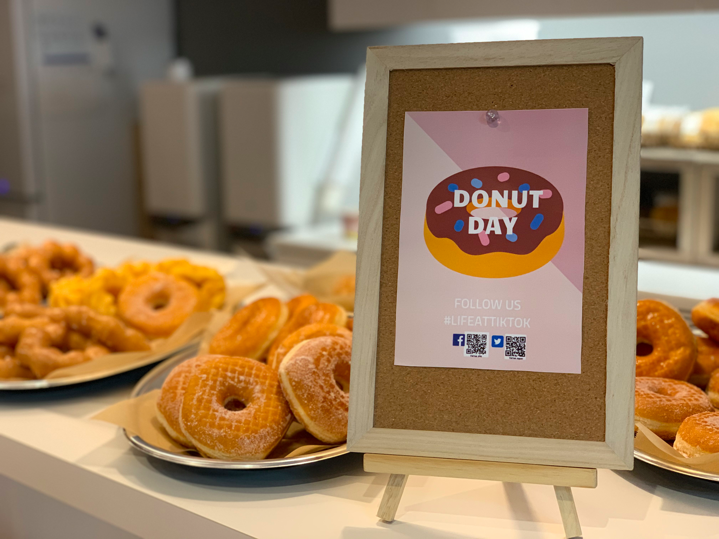 時にはドーナッツイベントのような変わり種も。これは6月のドーナッツの日に開催したのですが、何もない日でも、調べてみると実は何かの記念日であったりします。ただの平凡だと思っていた一日も、このようなちょっとしたイベントがあるだけで、一日元気が出ますね!