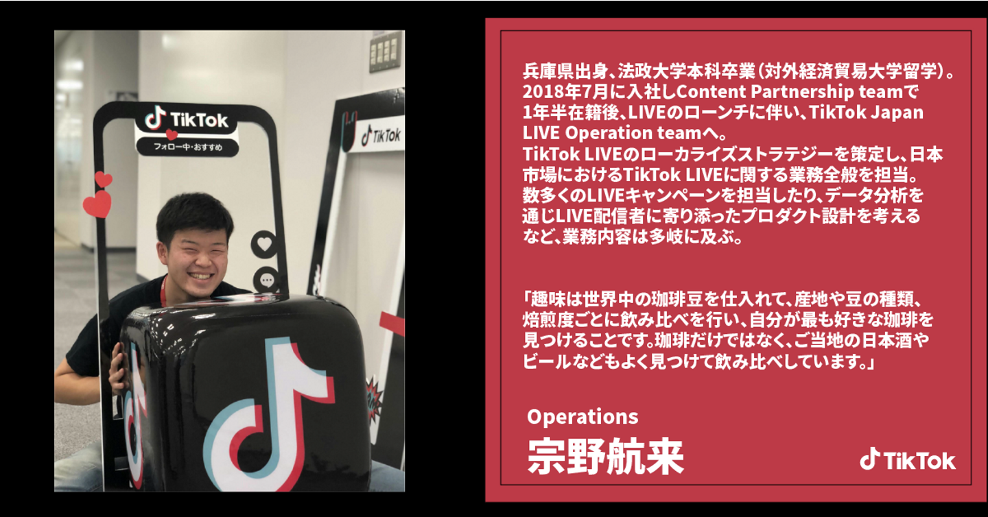 留学経験を活かすために外資系のIT企業で働きたかった宗野(ソウノ)がTikTokをファーストキャリアとして選んだ理由として、「ITによって日本にはないようなサービスをどんどん普及させたいと思っていました。そこで、ちょうど日本ですごい勢いで流行り始めていたTikTokに興味を持ちました。」と語ります。宗野はTikTok運営チームでTikTok LIVEの業務に携わっています。