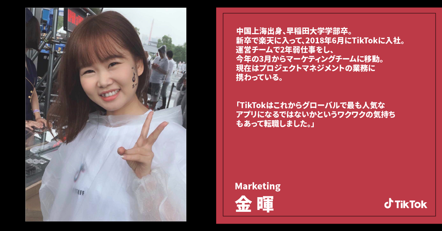 一方で、楽天で働いてた金(キン)はスカウトされてTikTokへ転職しました。理由として「ハイスピードな会社でチャレンジしたいなという気持ちが強かったです。また、TikTokはこれからグローバルで最も人気なアプリになるではないか、というワクワクの気持ちもあって転職しました。」と語ります。最初は運営チームにいた金は現在はマーケティングチームで働いています。