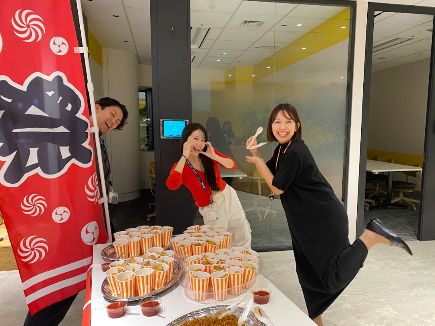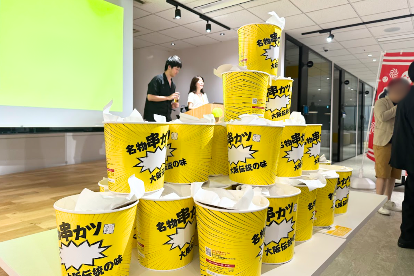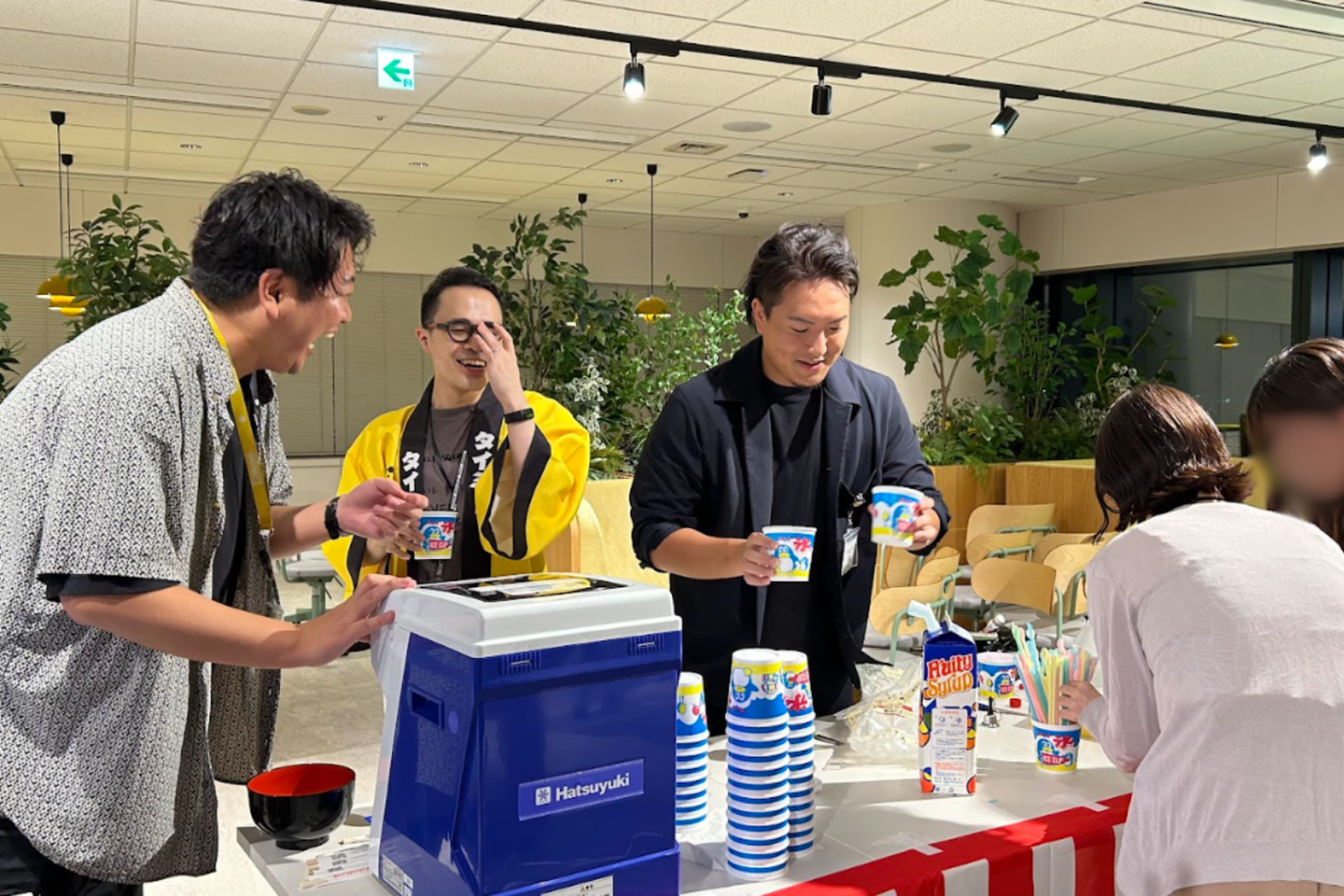 毎度恒例の会社説明会やオフィスツアーのあと、本社広場にて串カツパーティーを実施。「夏祭り」をコンセプトにして、やきそばやかき氷などの屋台飯もたくさん用意しました。