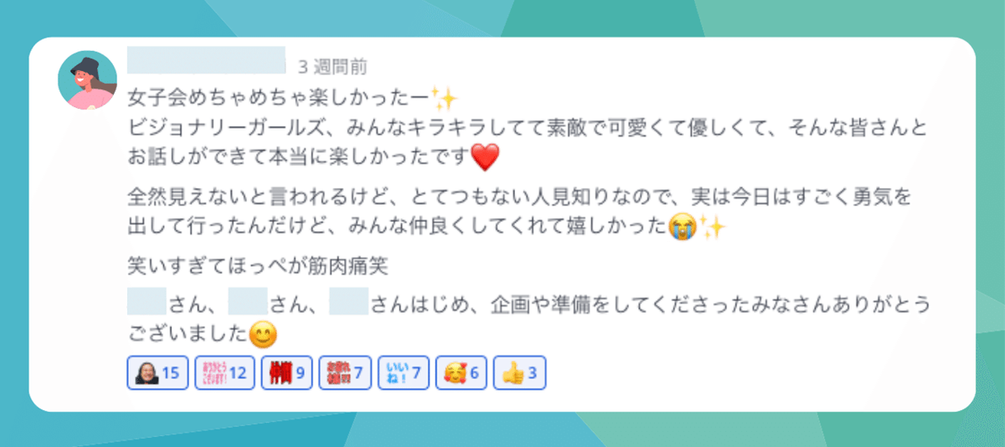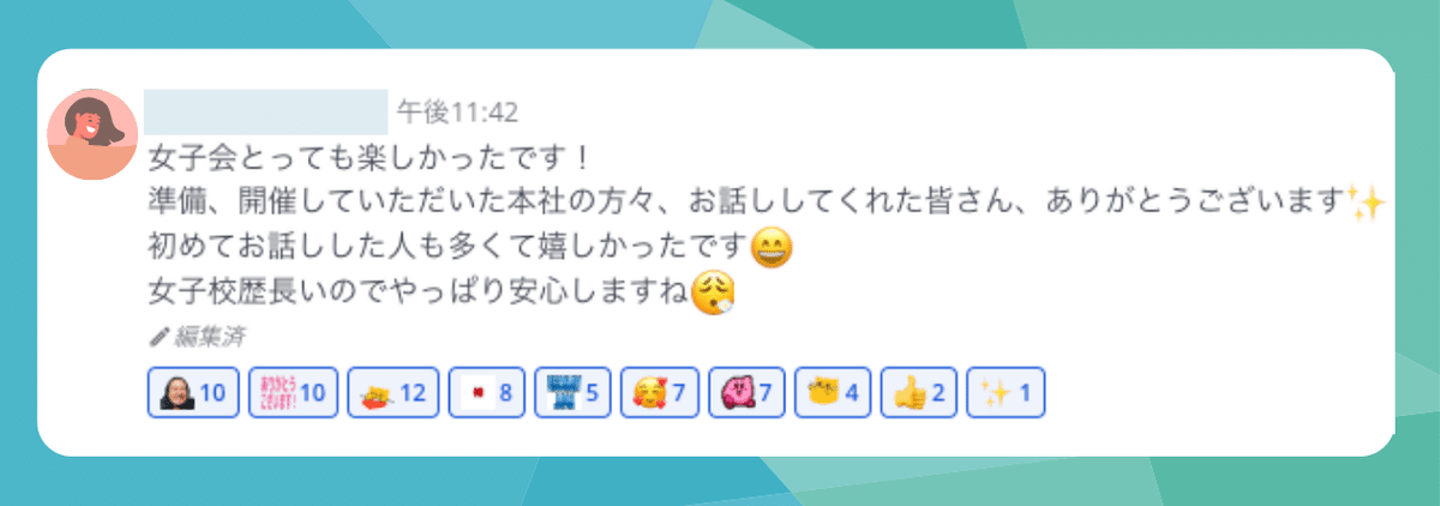「女子会また開催してほしい!」や「初対面の方とも色々話せた!」といった声がとても多く、女子会の企画は大成功だったなと嬉しく思います!今回参加できなかったメンバーもいるので、定期的に女子会開催したいと思います✨