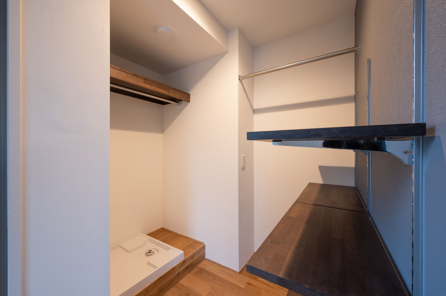 こちらは、居室部分の一番奥にある、洗濯機置き場と収納です。