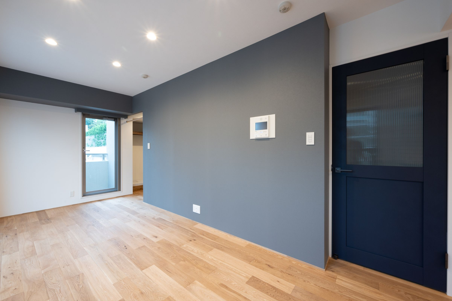こちら、居室のキッチン反対側からのアングルです。ドアはガラス面を広く取り、ヨーロピアンな雰囲気。紺色の建具は空間を引き締めながらも暗くなりすぎないので、戸建て・マンションともに根強い人気を誇っています。アクセントクロスとのカラーバランスが絶妙です・・・!上品な大人なお部屋という感じがしますね。