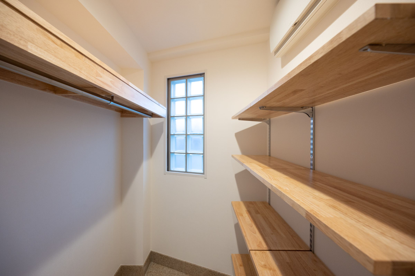 横には稼働棚とハンガーパイプも設置しているので、洗濯用品を置いたり、雨の日はとりあえず部屋干しに使ったりと便利ですね!もちろん普通に収納として使用するのも◎