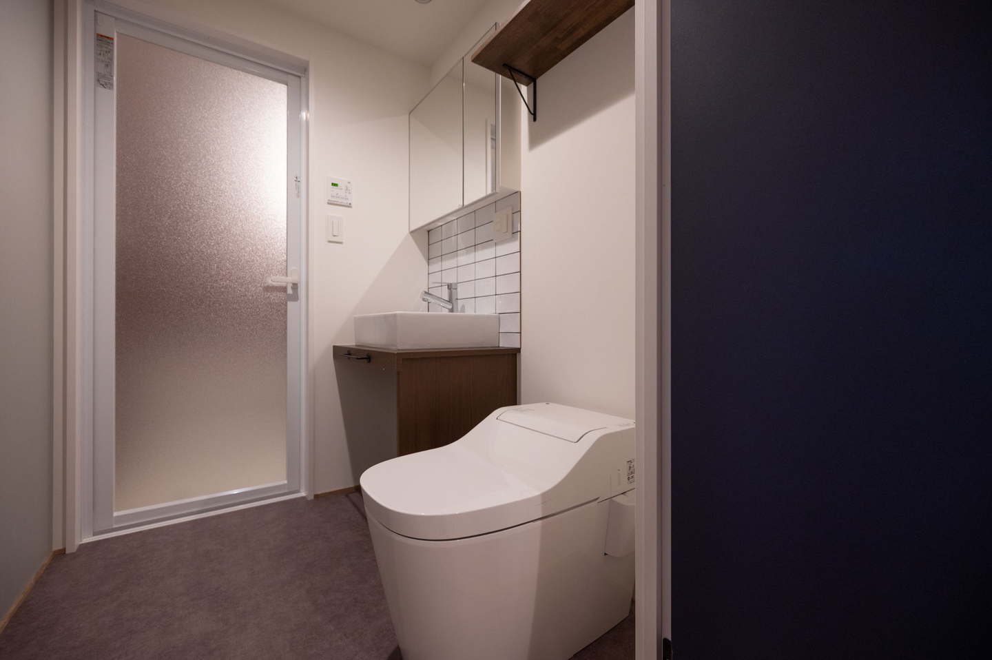 タイル貼りの洗面台がかわいらしく、この空間のポイントになっています。