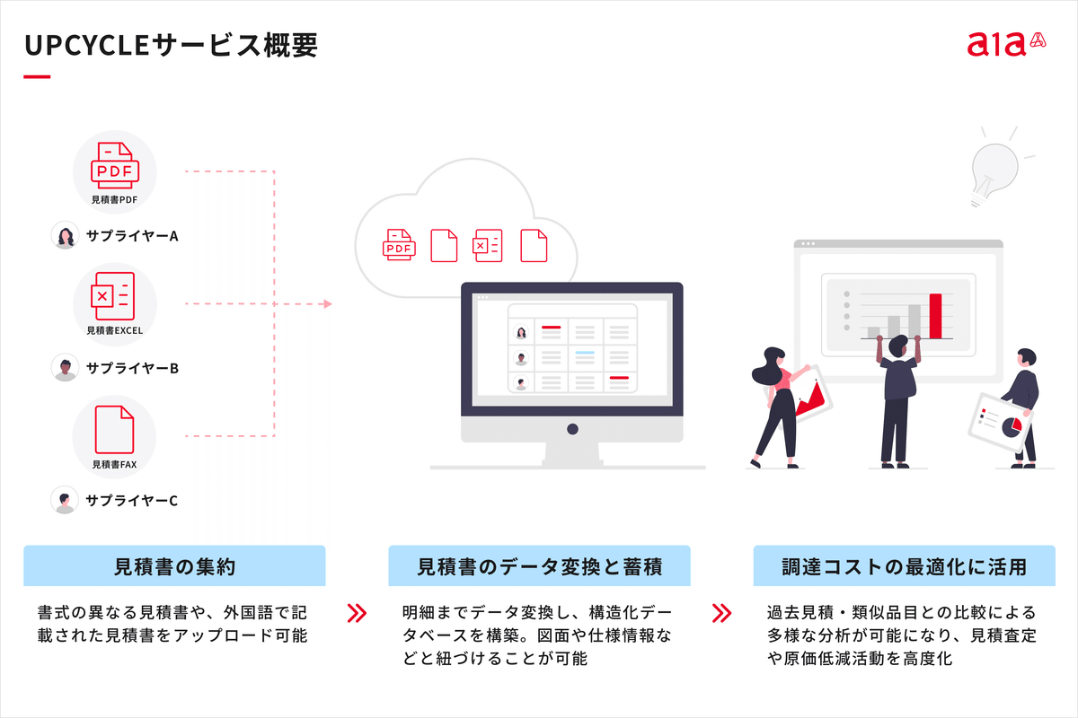 そこで、「サプライヤー毎にフォーマットも書き方もバラバラな書類を共通化して活用できるようにするというプロセスを全てA1Aが担うことで、サプライヤー側が感じていた変化による痛みというものを生まずに自社だけで変化できるようにしましょう。そうすれば調達・購買担当のみなさんは見積明細などの情報を活用できて、よりコストインパクト出せるのではないだろうか」というところで、UPCYCLEというプロダクトを考えました。