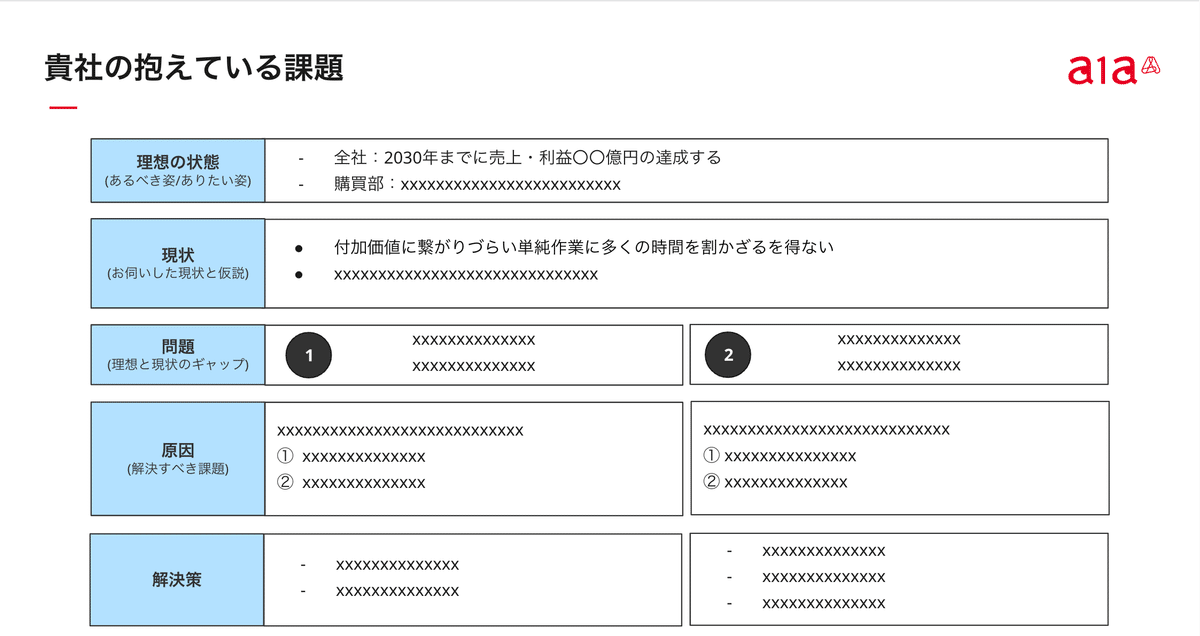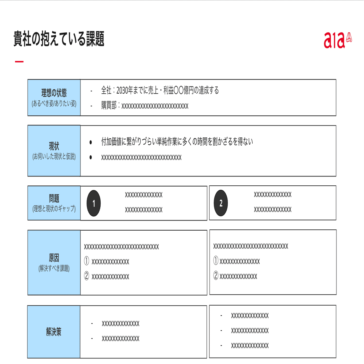 私自身も当初は「問題」と「課題」を混同して解釈していましたが、A1Aに入ってから、問題に対して取り組むべき行動が「課題」であることを学びました(ただ今もたまに実際の商談の場になると「問題」と「課題」を混同してしまうこともありますが…)。検討が進む中で、買い手側も多くの企業や社内の関連者と話すことになります。その過程でやるべきことが次々と増え、当初の目的がぶれてしまい本当に解決すべきことが見失われることがあります。これが原因で社内の承認が得られなかったり、プロジェクトが途中で頓挫してしまうことも少なくありません。