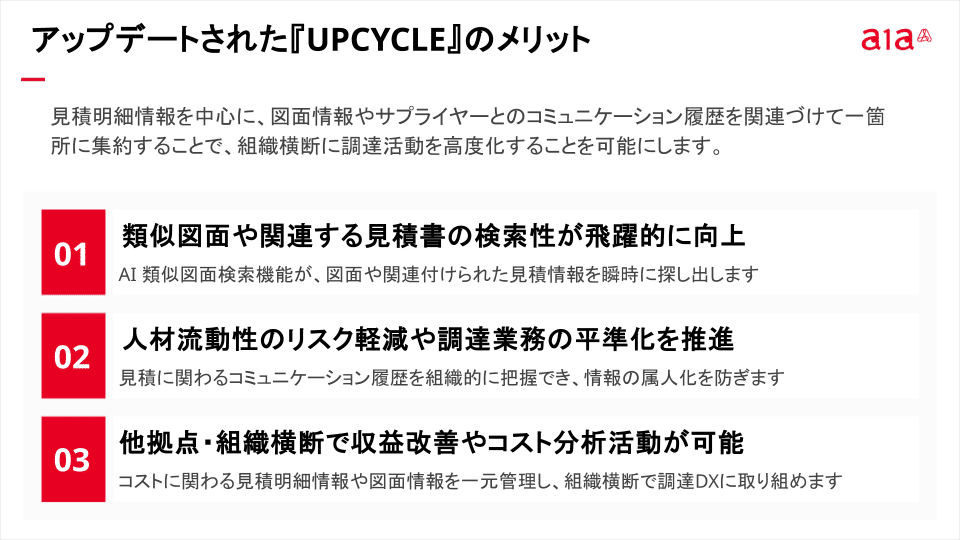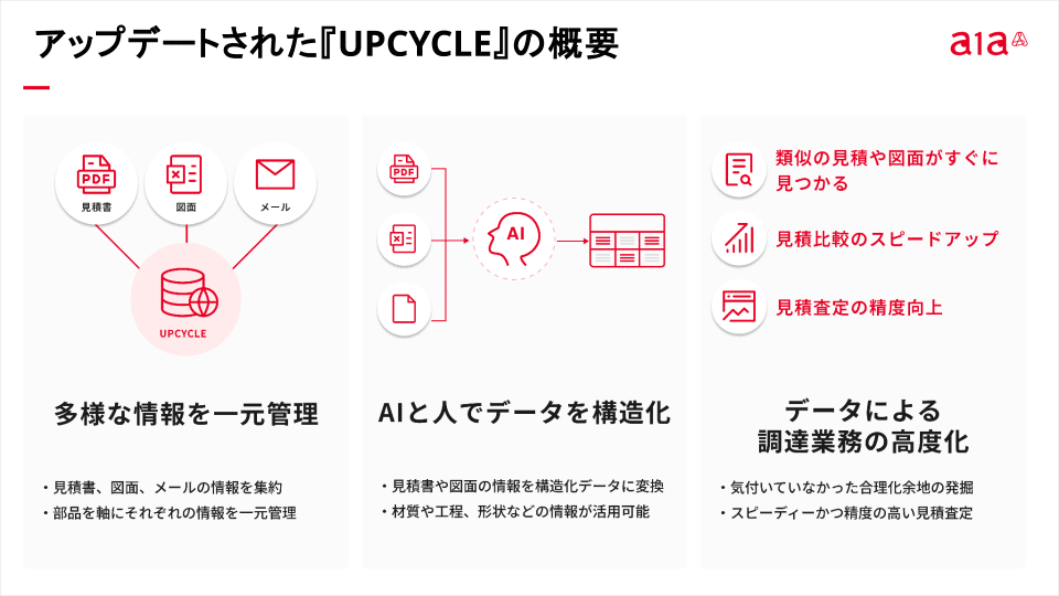 まず一つ目は、サプライヤーさんから受領する見積書を漏れなく自動的にUPCYCLEに蓄積できることです。これまでの「UPCYCLE」ではユーザがアップロードすることでデータ変換を行なって構造化されたデータベースを構築していましたので、確実に情報集約することが可能になりました。