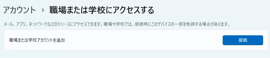 Windows設定 → アカウント → 職場または学校へのアクセス → 接続