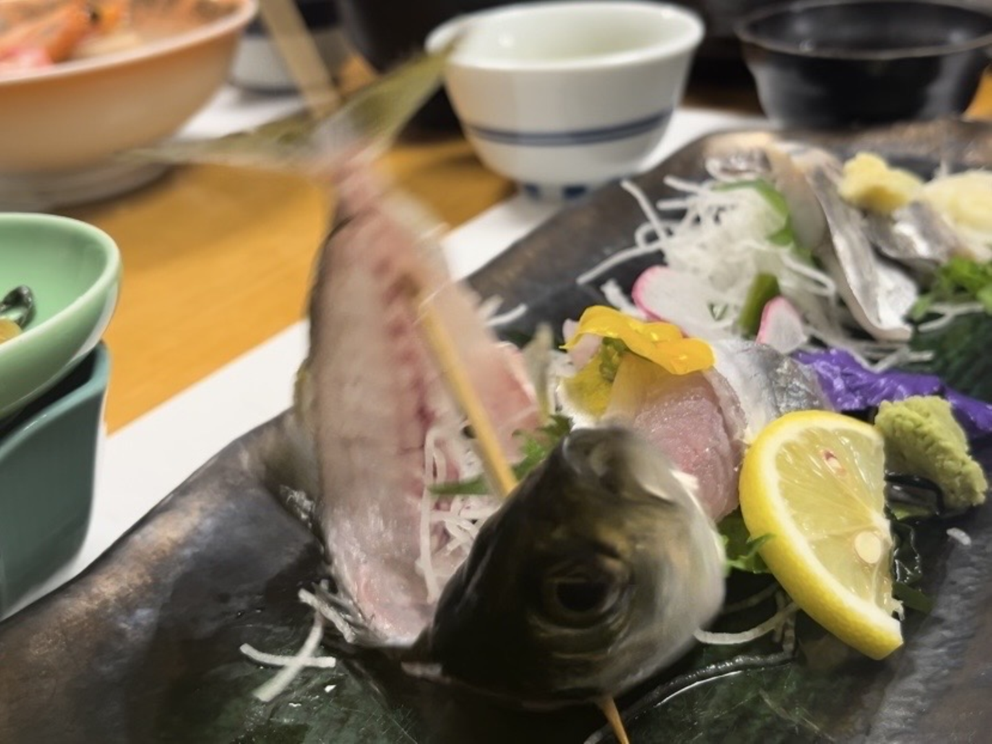 おろされて頭と骨だけになった魚がビクビクと動いていました……