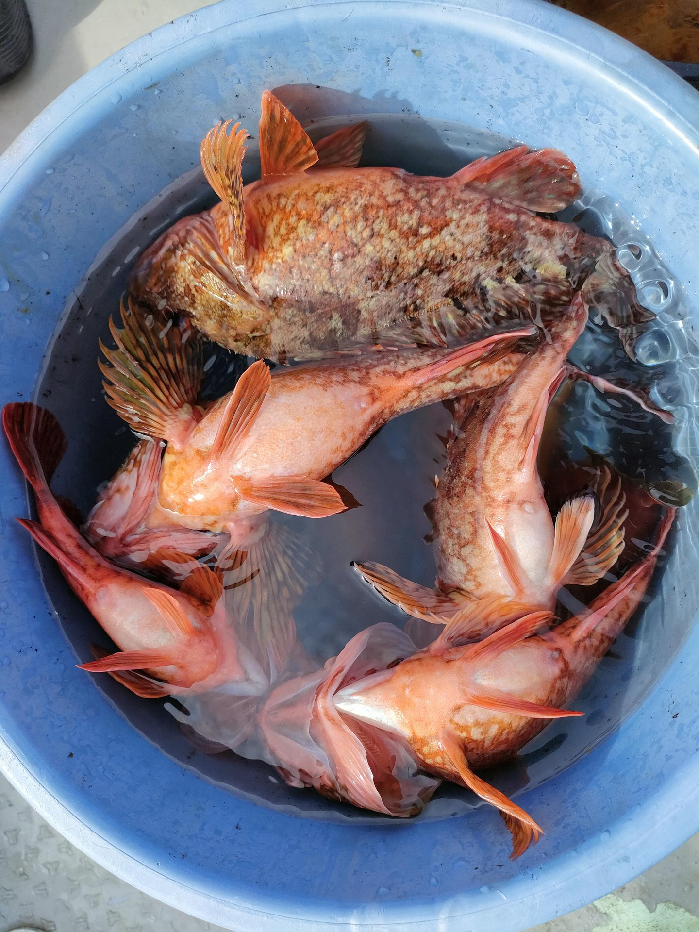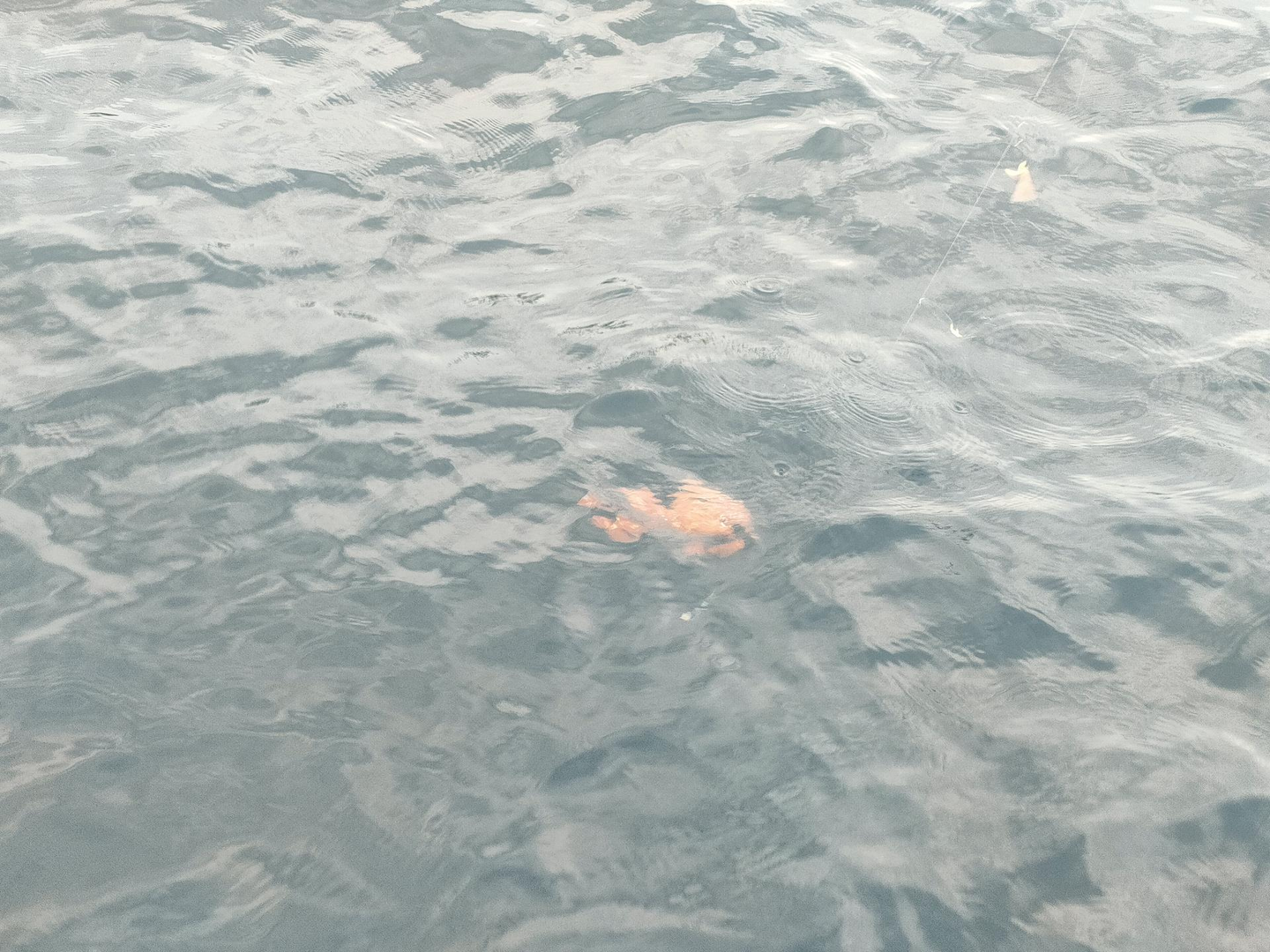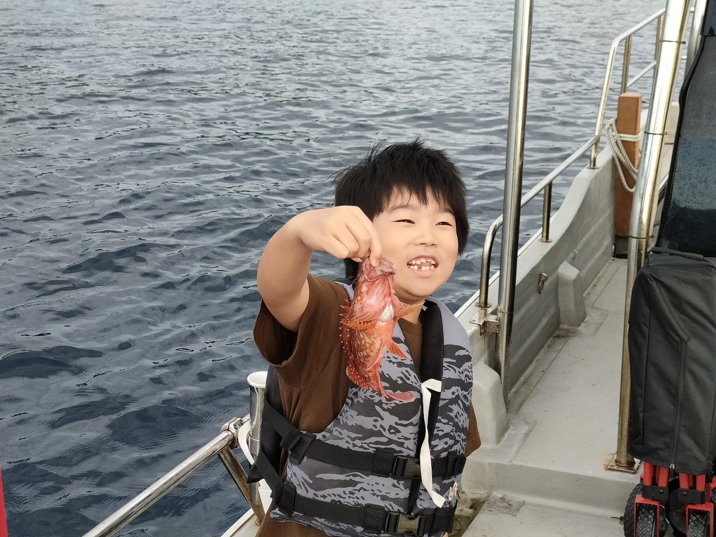 最初に竿をしならせたのは上司のお子さん。見事にカサゴを釣り上げて船内は大盛り上がり!