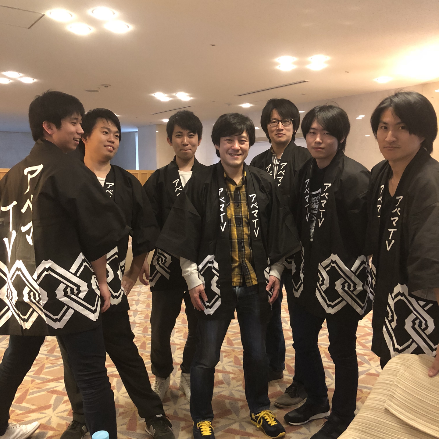 (写真)サイバーエージェントのグループ総会でのひとコマ。みんなでアベマ法被を着てグループ総会に参加しました^ ^