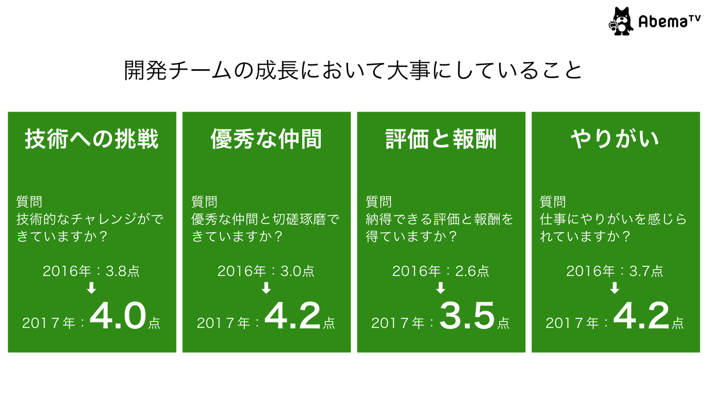 これまで2016年5月と2017年12月に計2回集計しましたが、この1年で全項目でスコアーが改善されました。特に大きくスコアーを伸ばしたのは「優秀な仲間」という項目です。この1年一切の妥協なく優秀なエンジニアを採用してきたことがこの結果に繋がったのではないかと考えています。また、「評価と報酬」においてもしっかりと改善出来たことは良かったと思います。