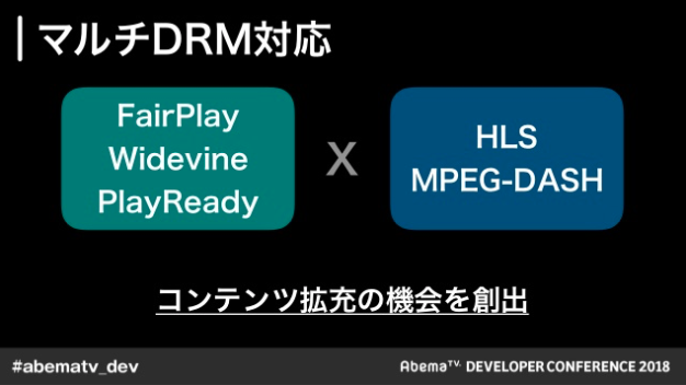 テクノロジーにおいて、マルチDRM対応は欠かせないものでした。現在AbemaTVでは、FairPlay、Widevine、PlayReadyといったDRMテクノロジーに対応しHLS、MPEG-DASHといった配信方式を組み合わせることで、マルチDRMの対応をしています。