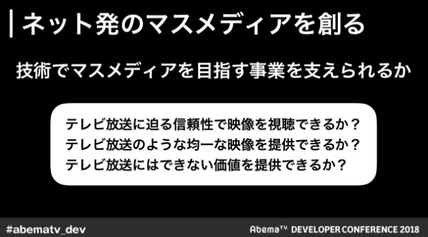 「テレビ放送に迫る信頼性で映像を視聴できるか?」「テレビ放送のような均一な映像を提供できるか?」「テレビ放送にはできない価値を提供できるか?」といった疑問に対して技術でアプローチを仕掛けたいのだと。