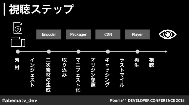 西尾がCTOを任されて最初にやった事は「技術ドメインの抽出とチーム化」でした。当時、上記の左図のように技術的なレイヤーだけで分割された極シンプルなチーム構成だったものを、動画インターネット配信をする事業にとって重要な技術ドメインを抽出して、上記の右手にあるようなかたちでチーム化を図っていったことを明かしました。そして、これらのチーム化を行うことの意味を伝えるにあたり、インターネットで動画を配信してユーザーに届けるところの視聴ステップがどのように構成されているかを説明しました。