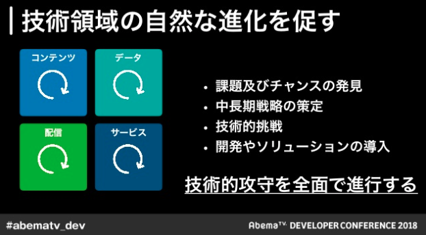 Keynote「AbemaTVはネット発のマスメディアを創る」では、開発本部長の長瀬に続きCTOの西尾亮太が登壇し、これまでの技術戦略と今後の技術領域の進化について語りました。