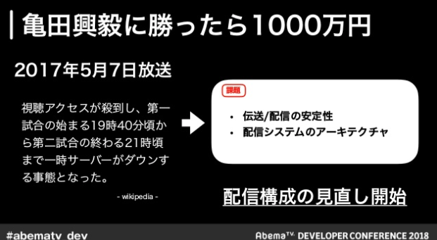まず、フェーズ2の「配信の安定化」を語るのに欠かせない出来事があります。それが2017年5月に放送された「亀田興毅に買ったら1000万円」という番組です。アクセスが殺到し、試合開始のゴングと同時にAbemaTVの全てのシステムが一時ダウンしたのです。