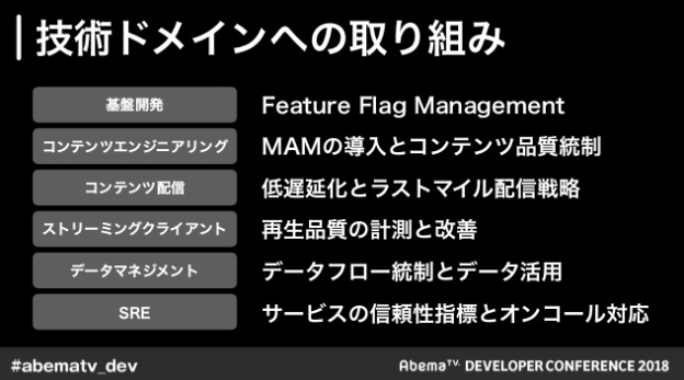例えば「コンテンツ配信」というドメインに対して、コンテンツ配信はインジェストからラストマイルの映像伝送と処理に対して責任を負います。ここを切り出してコンテンツ配信といった部分が、新しい技術に対して計画を立てていく。