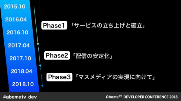 AbemaTVが本開局をしたのは2016年4月ですが、開発が本格開始したのは2015年の11月頃です。立ち上げから開発に携わる西尾は、この3年間を「サービスの立ち上げと確立」「配信の安定化」「マスメディアの実現に向けて」の3つのフェーズに分けてお話させていただきました。