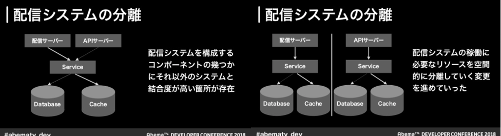 当時もう1つ大きなアーキテクチャの変革として「配信システムの分離」がはじまりました。当時のシステムは、配信システムを構成するコンポーネントのいくつかが、それ以外のシステムと結合度が高い状況にありました。この図はとても簡易なものですが、本当に複雑怪奇なシステムに対して、配信システムを分離するという、すごく労力のかかる作業を進めていきました。
